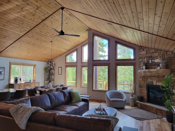 At approximately 2,200 sf, the open floorplan gives you the opportunity to reconnect with family and friends in one space. The upper level features a vaulted ceiling in the open living, dining and kitchen areas. The spacious and well-equipped kitchen includes a pantry stocked with cooking staples. A large island with granite countertop provides extra bar seating for three. Or, choose to cook outside using the BBQ grill on the upper deck that wraps two sides of the house. In winter, snuggle in and enjoy the gas fireplace and gather at the large dining table (seats 8) to enjoy a hearty meal.