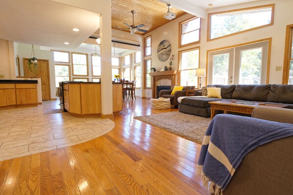 Offriamo tutto il necessario per trascorrere momenti meravigliosi con la famiglia o gli amici. All'interno, troverete sistemazioni pulite e confortevoli in uno spazio luminoso e aperto con pareti di finestre per l'abbondanza di luce naturale. La sensazione all'interno della nostra casa ti fa sentire come se fossi all'interno di una casa sull'albero di fantasia mentre 4 ponti creano un sacco di spazio all'aperto per godersi la terra. Rilassati all'interno, guarda un film sullo schermo del proiettore cinematografico di 11 piedi, immergiti nella nostra vasca idromassaggio per 6 persone o esci a fare una passeggiata per la terra, c'è molto da fare.