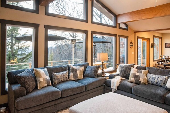 Open concept main floor living space with: eat-in kitchen, large living room, dining table for 8, woodburning fireplace, vaulted ceilings and expansive outdoor deck