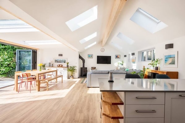 - Open-plan living and dining space with large bi-folding doors and multiple sky lights. A lovely space!