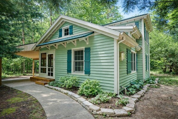 Outdoors, the cottage includes a private hot tub and a private fire pit, creating space for relaxation and evening connection under the trees. A screened porch and patio seating provide additional areas to unwind.