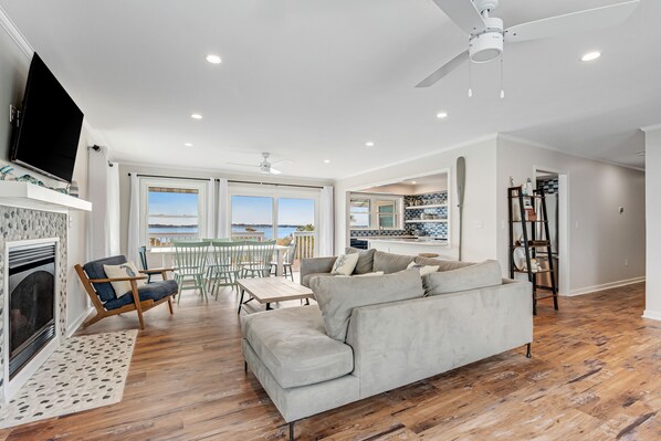 The upper level of this bright, beachy two-level home holds the main shared living space, including a gorgeously updated kitchen, with dark blue cabinetry and a complimentary backsplash, not to mention a full suite of stainless steel appliances and all the counter space you need to whip up a meal. You’ll find four barstools at the breakfast bar or a dining table set for six just adjacent when it’s time to eat. If the weather is nice, dine alfresco on your wraparound deck, which offers 360-degree view of the scenery and overlooks Assawoman Bay at the back.