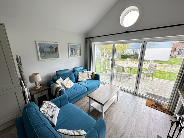 To the right is the open-plan kitchen / dining / lounge space with new sofa(s) (including sofa bed in 2023) and SMART TV (with Netflix, amazon prime, Apple TV etc - bring your own logins). Exit through the large bifold doors to the deck with seating, ideal for alfresco dining or sitting out whilst the children play outside. The lounge has a sofa bed which can be used to sleep 5 comfortably in the property.