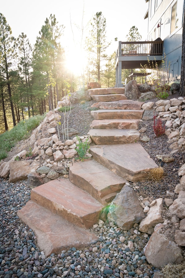 Enorme spazio esterno paesaggistico ideale per intrattenere e farti godere le fresche serate Flagstaff. Include 600 piedi quadrati di tappeto erboso, patio di 400 piedi quadrati con tavolo da otto posti, ponte di 200 piedi quadrati con pozzo del fuoco a gas, sedie e griglia a gas. Veranda coperta coperta con 1 panchina di roccia, 1 sedia di roccia e 3 sedie a sdraio in teak possono essere utilizzate per rimanere asciutte e divertirsi durante la stagione dei monsoni.