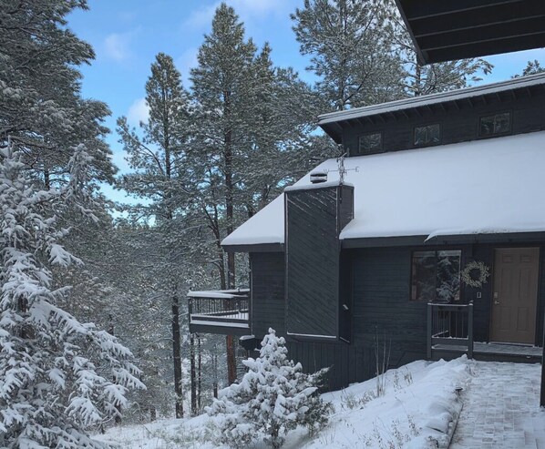 Spacious forest Main House with 3 bedrooms, 3 bathrooms on a quiet cul-de-sac in Kachina Village. Backyard with grill, firepit, horseshoes/cornhole, and HOT TUB! Great for family getaways to the cool pines of the Coconino Forest or as your home base for skiing in the winter. Sleeps up to 8 (6 comfortably, 2 more with the sleeper sofa in the living room). Backyard with grill, firepit, and hot tub (shared amenities with any guests in the detached Guest House). Being in the HOT TUB while it is snowing is like being inside a life-sized snow globe. Or, at night looking up at the stars, both mesmerizing experiences to behold.