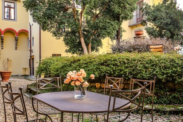 Incastonato tra Ponte Vecchio e Piazza Pitti questo delizioso appartamento si affaccia su un meraviglioso e tranquillo giardino (condiviso solo con Dragomanni Loft). Lascia il trambusto della città fuori dall'edificio e rilassati nel tuo giardino segreto! L'appartamento è stato completamente ristrutturato ed è composto da una zona soggiorno pranzo (con divano letto singolo), due camere da letto e due moderni bagni con doccia. Completano la proprietà un locale lavanderia e una zona salotto (entrambi accessibili dal giardino e condivisi solo con l'appartamento Dragomanni Loft)
