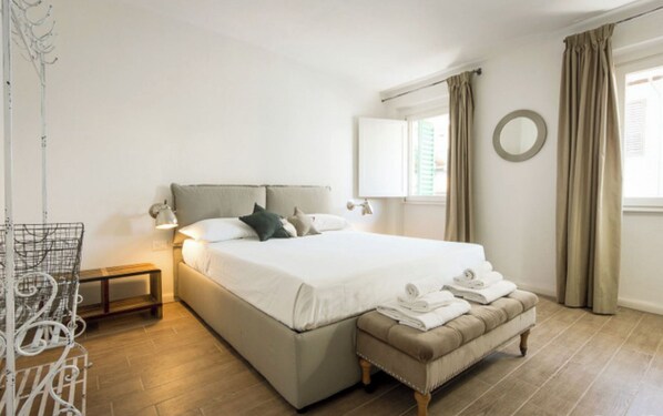 La camera da letto principale è inondata di luce naturale grazie alle due finestre, ed è dotata di un grande letto matrimoniale king size, consolle, e di un comodo appendiabiti / armadio a vista, oltre che di una Tv a schermo piatto.