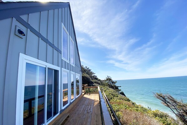 The cliffside views of the ever-changing ocean are mesmerizing from this 3 bedroom home that sleeps up to 8. The open concept living area has large windows facing the sea. The wood paneled walls, soaring wood beamed ceiling and rock fireplace will make you feel close to nature. Cozy up to the wood burning fireplace during a winter squall and enjoy watching the moods of the ocean (a starter bundle of wood is available for $10 if we are notified prior to check-in). Open to the living room is a full kitchen ready to help make some memorable meals and a large dining table to gather around. On each side of the living area is a bedroom with an ensuite bath and king bed. Each bedroom has a sliding glass door with access to the ocean front deck. A spiral staircase leads to a lofted bedroom with a king bed (that can be split into two twins with prior notice) and a sitting area with a queen sleeper sofa and television. The loft is at the apex of the A-Frame with views of the ocean and access to a deck off the back of the house. The Hidden Overlook features many cool maritime touches throughout the home.