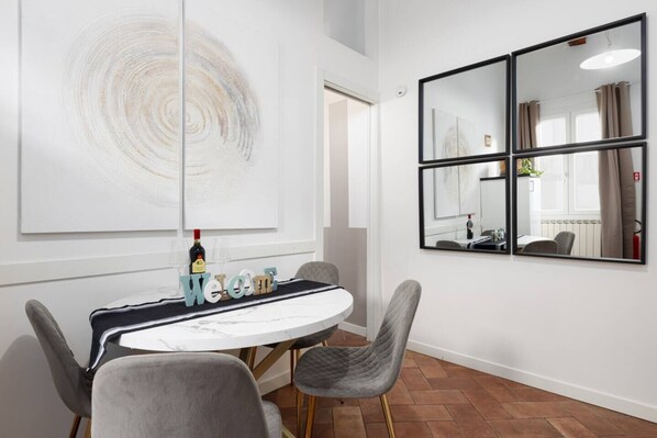La cucina abitabile è il cuore della casa: uno spazio luminoso e accogliente, perfettamente attrezzato con elettrodomestici di ultima generazione. Qui potrete preparare deliziosi pasti da gustare intorno al tavolo conviviale, godendovi il calore di un ambiente familiare e raffinato. La cucina è inoltre fornita di stoviglie, utensili e ingredienti di base come olio, sale e spezie. L’appartamento può ospitare comodamente fino a 4 persone, garantendo a ciascun ospite un soggiorno all’insegna della discrezione e della comodità. Gli spazi comuni sono stati progettati per creare un’atmosfera rilassante, con dettagli di design che richiamano la tradizione fiorentina, avvolgendovi in un abbraccio di bellezza.