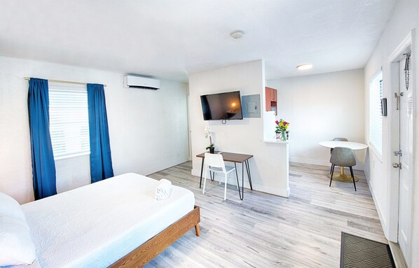 You'll love your pool-view studio with a queen bed where you can run many daily errands by foot, relax by the heated pool just outside, or walk 482 feet to the beach. Take a 10-minute walk to the Deerfield Pier where you'll find a vibrant nightlife, fine dining, and shopping! Your studio is only a 10 min. drive to downtown Boca Brightline Bullet Train, US1, I-95, and 35 minutes away from PBI Airport. After booking, every guest is sent our online guidebook to plan their stay. Hi-speed WiFi.