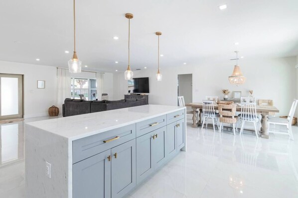The gourmet kitchen is a chef’s dream, featuring stainless steel Samsung appliances, dual-toned cabinetry, quartz countertops, and a stunning wraparound quartz kitchen island with barstools for four. Fully loaded with all the countertop appliances you could desire, this kitchen is ready to support your culinary adventures.