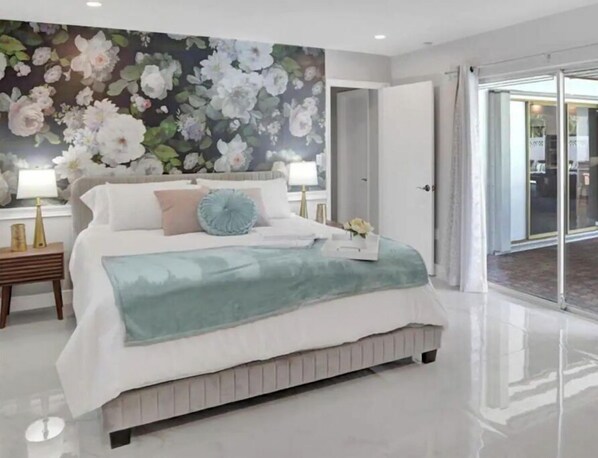 Tropical design with a beautiful floral master bedroom. Private luxurious bath includes freestanding bathtub, robes, high pressure spa like showers. Escape to the Jungle or join the captain at sea. This home was designed to bring your vacation to the next level!