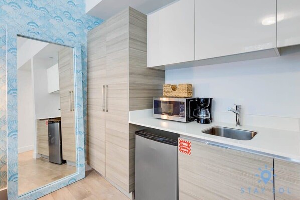 The fully equipped Gourmet kitchenette offers a mini fridge, an integrated microwave, one coffee maker, and a toaster. Spacious bedroom with a hairdryer, an electronic safe within the suite, one iron/ironing board, and TVs.