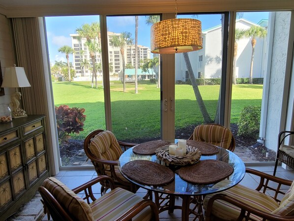 Checkout out this 1st floor end unit. Everything says “Life Is Better at The Beach” in this stunning fully furnished, 2 Bedroom 2 Bathroom condo with a separate dining area with seating for 6. This treasure is everything you requested for your next Florida vacation. This unique unit is a little gem, with detailed workmanship throughout. One of a kind unit. Lounge in the living room and enjoy some entertainment, sofa bed in living room also included. The master Bedroom features a cozy King Size Bed and a Flat Screen Television and master bath with shower stall and walk-in closet. Guest bedroom offers a queen-sized bed. Built in patio area gives extra space for relaxing and outdoor seating for 2. Wi-Fi is Available as well as Washer/Dryer.