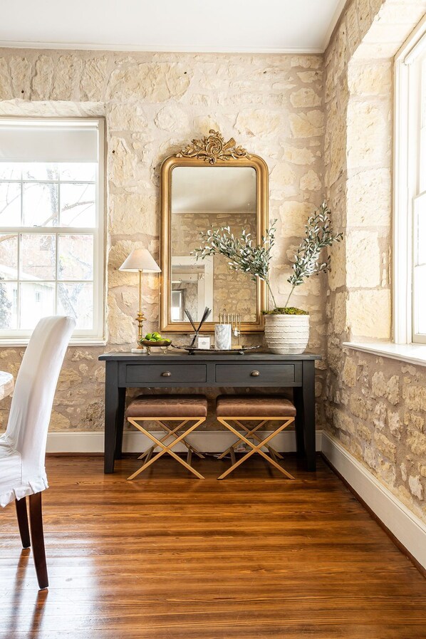 My friends and I can’t say enough great things about this gorgeous historic home. Convenient onsite parking, huge backyard, easy to use fire pit and comfortable porch rockers are just a few of the outdoor amenities we appreciated. Inside all of the modern conveniences you would want in a tastefully decorated home with beautiful original stone walls. Comfortable beds let us get plenty of rest after our short walk home from Main Street. You are never really sure what you are going to get when you book online, but this house was a home run and we will be back soon!