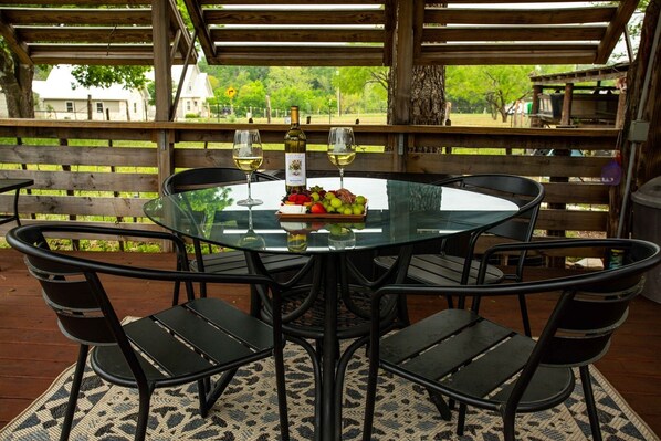 AMENITIES - 48” smart TV in living area, WiFi, hot tub, washer & dryer, covered outdoor deck with pergola & seating, charcoal bbq grill (no charcoal provided)