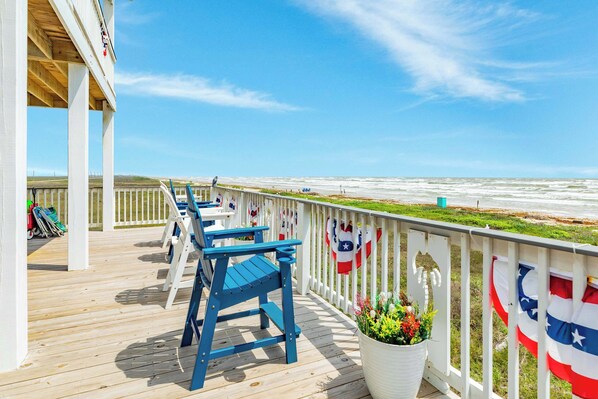 The beautiful 4BR 4.5BA will comfortably fit your large family, a girl's trip or a friends get away! There are 2 king beds, 1 queen bed, and 2 full beds to comfortably accommodate 10 people. This property boasts two large decks and plenty of seating to take in the beach front views, we have provided extra chairs that are stored inside to bring out on the deck and enjoy. Downstairs, under the house is covered where you can grill out no matter the weather. This home offers great entertainment spaces both inside and out. There is a whole house water filtration system AND a water softener/treatment system on this property, we have never had issues with our water quality, however we still recommend bringing drinking water. We have also provided a water dispenser system (just BYO 5-gallon jug!) and a deep freeze to store ice during your stay. There are plenty of beach chairs and toys that we welcome you to enjoy while you are staying in our wonderful property! We have a lovely outdoor shower for use downstairs that offers hot and cold water for a quick rinse after the beach. There are two dehumidifiers in this property that are constantly running to create the perfect temperature in our home and alleviate the gulf moisture! This property is located in the City of Surfside, so you have quick access to many restaurants, Surf shops, and Golf Cart Rental Services! Check out our Guidebooks for our recommendations.