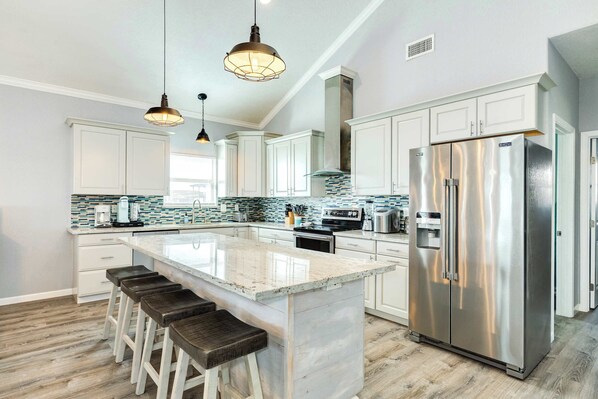 The beautiful 3BR 3BA will comfortably fit your large group. The main floor features an open living area with large windows that provide stunning ocean views. The fully equipped kitchen includes modern appliances and a generous island, perfect for preparing meals and entertaining. Each bedroom is designed for comfort, with the master suite offering a king-size bed, en-suite bathroom. The additional bedrooms are furnished with a queen sized bed, two sets of bunk beds and share well-appointed bathrooms. This beachfront property also features a portion of the yard that is fully fenced to allow your pets or children to safely play outside.