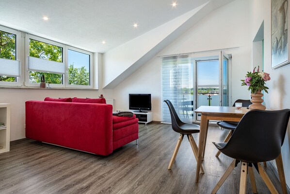 La luminosa zona pranzo e soggiorno è dotata di un tavolo da pranzo per un massimo di tre persone, un divano letto (3a persona prenotabile su richiesta) e una TV. La cucina, la sala da pranzo e il soggiorno sono un unico grande spazio aperto. Il balcone, completamente protetto dalla pioggia, invita a prendere il sole con il bel tempo. È attrezzato con mobili da giardino e un ombrellone.