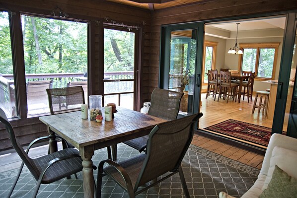 Redtail Retreat: Questa bella casa di tre camere da letto di 2500 piedi quadrati, nascosta tra gli alberi del The Galena Territory, è un ottimo posto dove ritirarsi. La porta d'ingresso si apre in una sala riunioni conversazionale con molti posti a sedere. Adiacente alla sala di raccolta è l'ampia zona cucina che è separata dalla zona pranzo da 8 persone da un bancone con sgabelli che consente ai cuochi di conversare con quelli al tavolo. Il portico schermato si trova appena fuori dalla cucina e il ponte esterno che è dotato di un barbecue grill a gas. Il piano principale ha la camera da letto principale con bagno padronale annessa. Questa camera da letto ha un letto king size con una TV satellitare a schermo piatto, il bagno adiacente ha un box doccia, doppi lavandini e vasca idromassaggio. Al piano inferiore, nel livello inferiore, ci sono due camere da letto e una sala riunioni / media. La prima camera da letto ha un letto queen size con un bagno annesso (doccia con un posto a sedere). La seconda camera da letto, con una TV satellitare a schermo piatto montata a parete, ha un letto king size con un bagno annesso (vasca / doccia) che è condiviso con la sala riunioni / media al piano di sotto. Questa sala riunione / media al piano di sotto ha un divano componibile con una poltrona, grande TV satellitare a schermo piatto (DVD), camino a gas che si accende con una vibrazione di un interruttore e una barra bagnata. All'esterno del livello inferiore è il ponte con panchine avvolgenti e una vasca idromassaggio che può ospitare 6 persone.