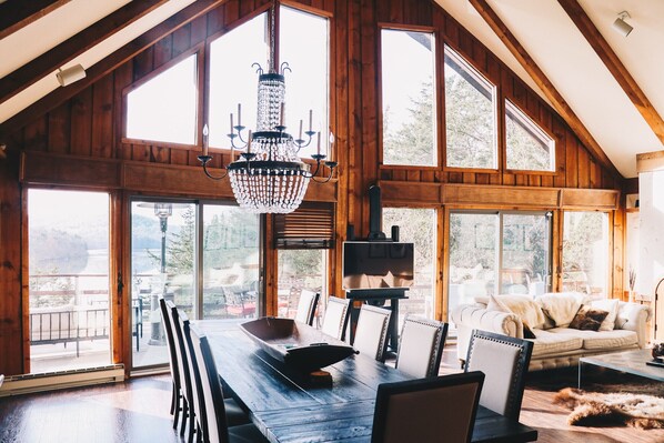 L'interno dello chalet vanta una lavorazione del legno e un'architettura di influenza europea. Il design degli interni è una bella fusione di rustico-moderno. La casa ha un tavolo da pranzo di recupero con 10 posti a sedere; divani duellanti a parte il camino in pietra a legna; e un'area giochi e biliardo di livello inferiore che circonda una stufa a legna decorativa che può anche ospitare comodamente fino a 10 persone.