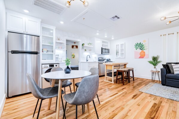 Pull up to this cheery green home and instantly be charmed. Open the front door to fresh and modern decor, and tasteful touches of color. With an open-floor layout appreciate the flow of effortless conversation sure to ensue within its walls. Lounge on the comfy couch and switch on your favorite TV show. Adjacent to the living room you will find the well-equipped kitchen and dining room. Complete with stainless steel appliances and ample seating, this space is great for preparing a meal for the one you love the most. In this space, you will also be able to access a private washer/dryer.