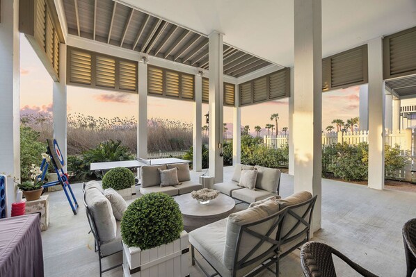 This beautifully designed beach cottage offers plenty of space for a family vacation! With four bedrooms, including a bunk room that features four twin beds, and three full bathrooms, it’s perfect for families. Located in Beachtown ’s East Village, the cottage is just one row from the beach and situated alongside an open green space, providing guests with stunning sunset views and opportunities to watch ships navigate through Galveston Bay.