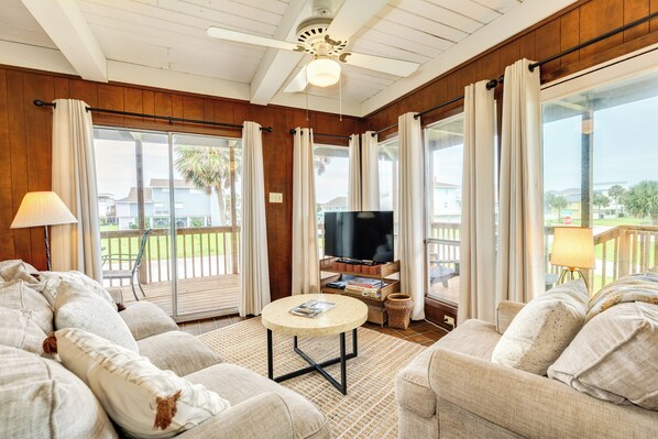 With a classic wood and cream-tone interior, this cozy beachside escape is comfortably furnished to feel like home. The wall of windows is front and center, illuminating the room with natural island light. A plush couch and armchair are perfect for enjoying conversation, family movies, or simply appreciating the Galveston sunset at the end of your vacation day. The fully-equipped kitchen has plenty of storage for beach snacks and is great for whipping up quick meals. Or to make things easy, explore Galveston’s restaurant scene with a different takeout meal each night!