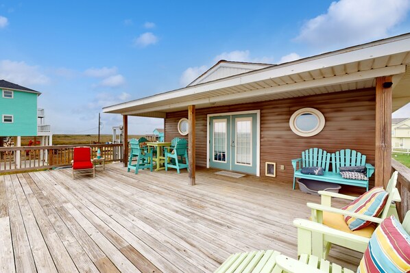 During downtime, the open interior will have more than enough room for everyone to spread out and take their pick of kicking back to watch a favorite show on the flatscreen TV, hop into the full kitchen to whip up tasty meals, or host a game night at the dining table. With all of the major appliances and cookware you are used to, homecooked snacks and meals will be a breeze, and a gas grill is provided when you want to indulge in a cookout in the warm coastal breeze.