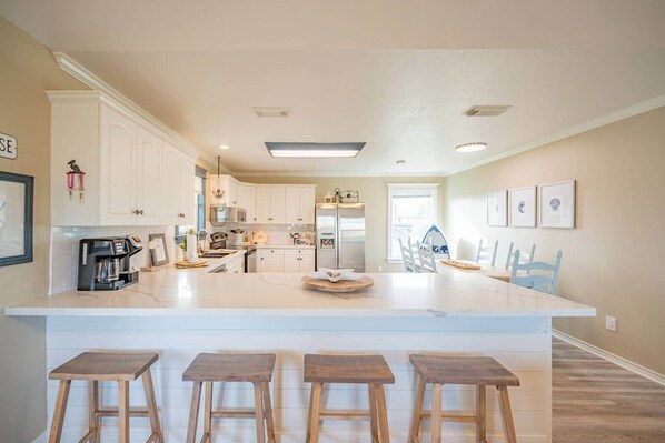 The home is impeccability decorated and maintained. The kitchen is loaded and equipped with everything you need to prepare a gourmet meal. Recently updated the kitchen features quartz counter tops, subway tiles and stainless appliances. The large coastal-farmhouse table has seating for 6 and the counter-height breakfast bar features seating for 4!