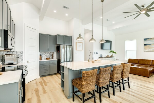 Foodies, rejoice! The contemporary kitchen is ready for your culinary escapades. Whip up budget-friendly meals with ease using the modern appliances and abundant counter space. Or take full advantage of delicious local eateries with take-and-bake options. The dining area is the perfect setting for family feasts, featuring a spacious table with bench seating that encourages lively conversations and shared laughter. The kitchen island has seating for four, ideal for quick snacks and breakfast pancake bars.
