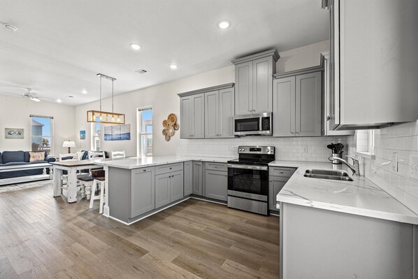 Bungalow Beach offers brand new, 3BR/2.5Bath, 1600+ sq. ft. homes with the best island beach access location, which is directly across from the Bungalow Beach entrance. Amazing sunrises and sunsets from the two covered decks, one facing the Gulf and one facing Galveston Bay. This 10-acre community with it's large open green spaces and a private freshwater pond offers wildlife/bird watching as well as catch-and-release fishing. These homes sleep 10 (max 6 adults) with 6 beds, two King bedrooms plus a bunk bedroom with twin over full beds that can sleep up to 6. Fully equipped kitchens include Keurig coffee machine and a Ninja Blender. FREE WIFI and smart TVs in every bedroom. Each house is also equipped with a Washer and Dryer. Enjoy BBQ or grill some burgers with the charcoal grill on the covered, concrete ground floor patio. Refresh in the outdoor, hot/cold water shower after a fun day of sunning, swimming, surf casting, bicycle riding and building sandcastles. Get ready for a relaxing, carefree holiday, hosted by our on-site staff that is dedicated to quality service for you and your guests. This laid-back, West End location is well suited as a home base for visiting all the attractions and events Galveston Island has to offer.