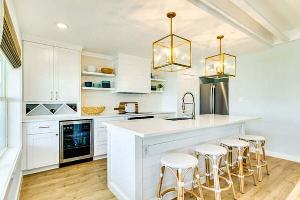 Step inside and you’ll find comfortable couches, perfect for relaxing with friends & family. Two distinct seating areas means the kids can catch a movie while the adults catch up with each other. The bright & airy open plan lets the family chef be part of the fun. Cooking is effortless in the fully-equipped kitchen, complete with stainless steel appliances and large kitchen island with seating for 4. Seat 6 more at the dining table while you indulge in your favorite vacation cuisine - fresh Gulf seafood anyone?