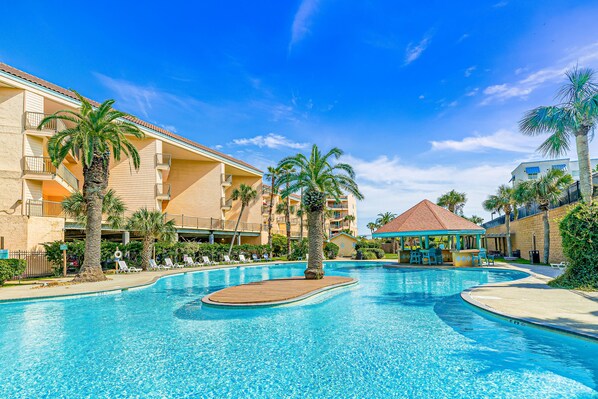 Book this charming getaway and you will have unlimited access to a shared heated outdoor pool, a resort-style pool and hot tub, charcoal grills, and laundry facilities on-site. This home away from home boasts a convenient location. You'll be mere steps away from the beach, restaurants, coffee shops, and the famous Jimmy's on the Pier. Get a much-needed adrenaline fix at the nearby Schlitterbahn Waterpark Galveston, less than two and a half miles away.