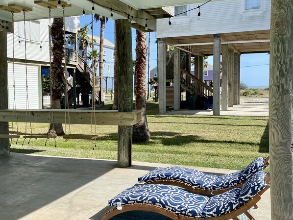 Beach Jewel offers a spacious deck off the main entrance. We've also put together the perfect outdoor oasis. Downstairs you'll find string lights, lounge chairs for tanning, Adirondack rocking chairs for group chats or roasting marshmallows around the fire pit, picnic table for afternoon lunches, and bar height table and swing-chairs for chillin' and relaxin' with a drink while watching the waves. Need I say more?!