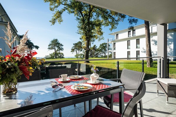 L'appartamento con 119m² di spazio vivente ha un ampio soggiorno-sala da pranzo con cucina aperta, camino bio-etanolo, divani in pelle, TV satellitare (incl. SKY). Connessione W-Lan gratuita. Attrezzatura Cucina: frigo / freezer, forno, lavastoviglie, piano cottura in vetroceramica, tostapane, macchina per il caffè (filtro e capsula marca Cremesso), spremiagrumi, bollitore. 2 camere da letto con letti sommier 1,80m x 2,00m e SAT-TV1 camera da letto con divano letto, zona notte (0,90m x 2,00m o 1,80 x 2,00m) e SAT-TV. Per dormire 1 ampio bagno (en-suite) con cabina docciaBagno 2 con cabina doccia 0,90m x 0,90m. Gli asciugacapelli sono disponibili. Ampia terrazza solarium coperta con tavolo da pranzo e due poltrone reclinabili -Sollevamento-posizione-2 poggiapiedi. Questo appartamento ha un'uscita laterale dal soggiorno verso l'esterno. Qui tavolo con sedie e 2 lettini. Ottima vista sull'acqua. L'appartamento ha un posto auto coperto. e un deposito per biciclette privato e chiudibile a chiave. È disponibile un'opzione di ricarica per le biciclette elettriche. Culla (senza biancheria) e seggiolone sono gratuiti fino ad esaurimento scorte.