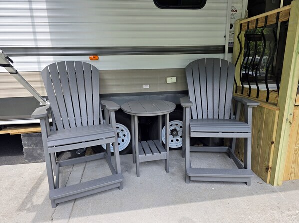 The outside of Miss Daisy has not been forgotten either. The stereo & speakers add a nice touch while you are sitting next to the fire pit. Our charcoal BBQ grill makes grilling & eating outside easy & enjoyable. We include outdoor seating for 6 people so nights by the fire pit are more enjoyable!