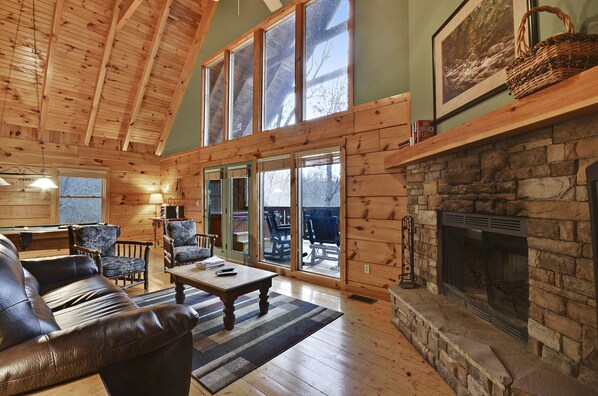 • A vaulted great room with wood-burning fireplace, plenty of natural light, and warm wood finishes