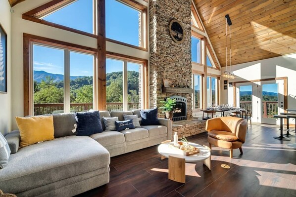 * Open concept living room + kitchen with soaring ceilings to accommodate the whole group