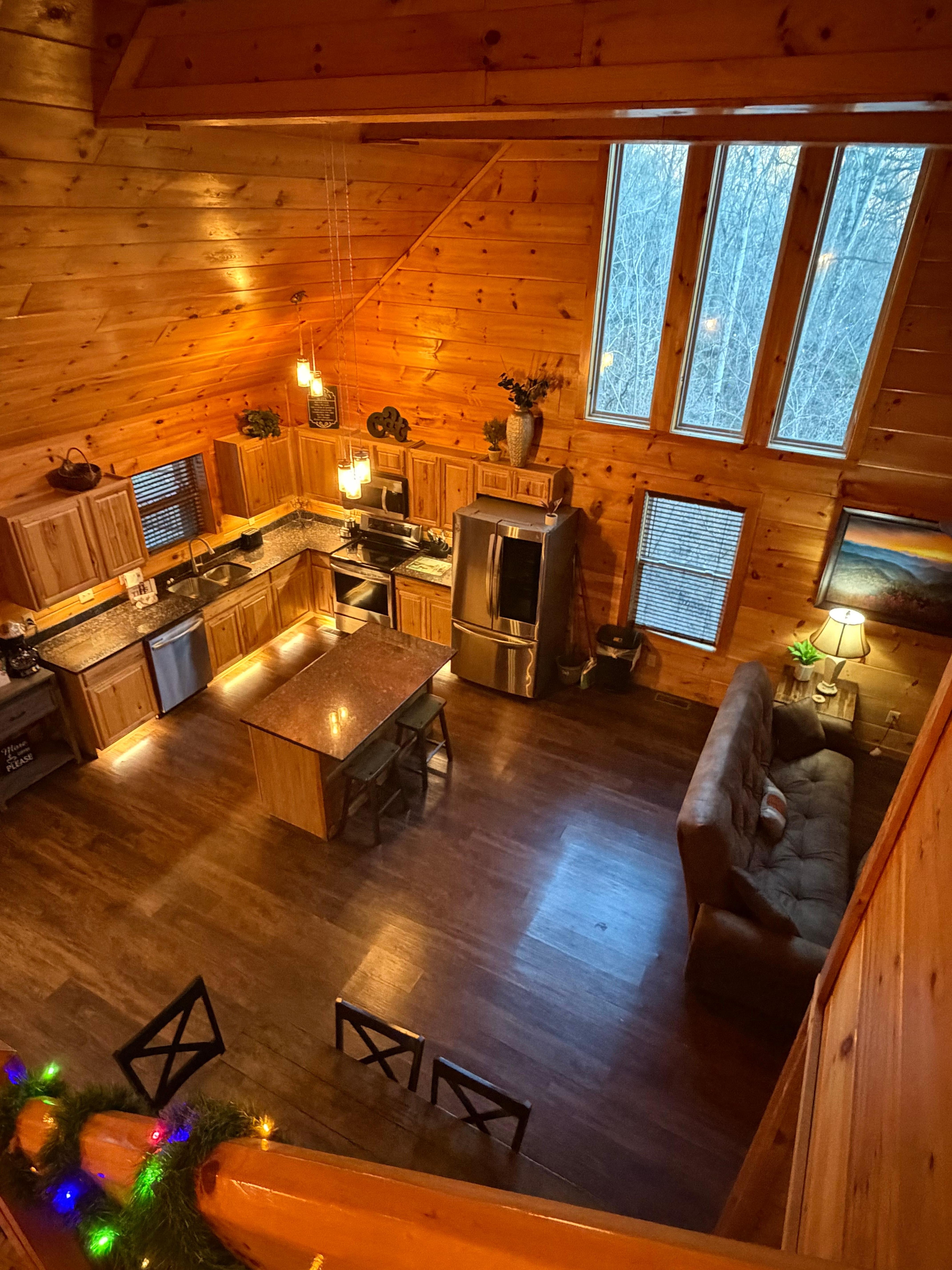 Located on a private road just 10 minutes from downtown Gatlinburg, the cabin features large open ceilings, a private indoor pool, a hot tub with mountain views, and a game room. The upper-level bedroom offers a clear view of the mountains, creating a peaceful setting to wake up to. The kitchen is equipped with essential appliances for easy meal prep. Outside, guests can enjoy the fire pit and games like cornhole, making it easy to relax or have fun together.