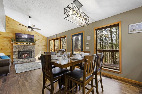 Or enjoy time together with your family just hanging out at the cabin. Take advantage of the theatre/game room that boasts two arcade games, a comfy sectional, and a 75-inch tv set up on a beautiful console with a cozy electric fireplace. Enjoy a family game night with cards or board games, or maybe you’ll want to slip off for a relaxing soak in the hot tub. Eating out is always a treat, but sometimes you may want to just skip the wait at the restaurants and grill out or prepare a meal in the fully-stocked kitchen for your family. Get a good night's rest and wake up the next morning to enjoy coffee and quiet time on the deck. Then, go get ready for another day of making Smoky Mountain memories with your family.