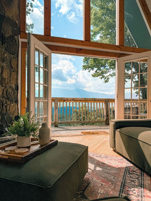 ✔ Level 2 - Front door, wall of windows, kitchen, dining for 8, bedroom (2 double beds) and full updated bath, family room with 60" roku tv, modern sectional sofa, two additional reading chairs and wrap around deck with MONSTER view and hot tub!