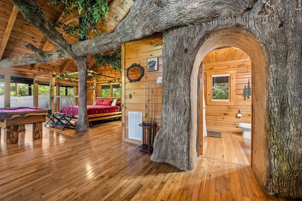 A full-sized pool table and electronic dartboard offer plenty of entertainment. The four-poster king bed is the cabin’s centerpiece, with a tree trunk as one of the posts and a canopy of silken vines overhead. The bathroom is equally unique, with an arched doorway cut into a tree trunk and a stone-lined shower.