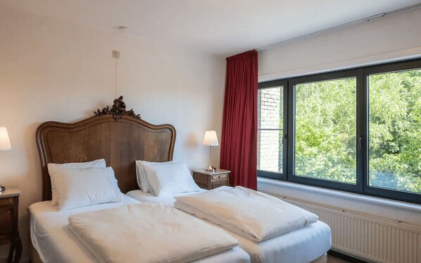 Upstairs : 2 bedrooms, each with 2 box-spring beds of 200 cm x 90 cm ( can be placed separately or against each other). One bedroom for 3 people with bunk bed 200 cm x90 cm and a luxurious folding bed of 200 cm x 90 cm. Duvets and pillows are provided , but you can cover your own down duvet and bring pillowcases.
