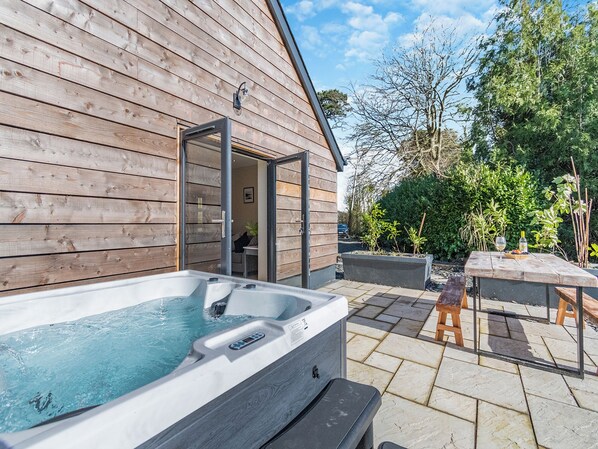 Shower Room: Walk-In Shower, Heated Towel Rail, Toilet. Electric storage heaters, electricity, bed linen, towels and Wi-Fi included. Travel cot and highchair availbale on request. Welcome pack. Enclosed back garden with patio, sitting-out area and garden furniture. Hot tub for 4 (private). Sea fishing nearby. Private parking for 2 cars. No smoking.. Come and enjoy a break at Bwythyn Cudd, nestled peacefully surrounded by lawned gardens and mature trees this delightful cottage has been meticulously crafted and is brand new in 2023 offering the perfect base to uncover this truly beautiful coastline and the picturesque harbor village of Goodwick which is a 15-minute stroll away. Enjoy dining alfresco on the patio followed by star gazing from your very own private hot tub with a glass of wine. Pure bliss. Set privately within the large grounds of the owner’s home, this all-on-one-level cottage offers the perfect property to indulge, finished to a very high standard throughout with style and comfort a priority this property really does offer it all, the open plan kitchen, dining, and living room is flooded with natural light and leads out to your own south facing garden where you can soak up the sun. Both bedrooms boast high-quality linens, furniture, and a high level of comfort.