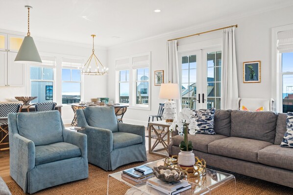 - Open-Concept Living Area: Bright and spacious with Gulf views, the living room, kitchen, and dining area are perfect for gathering and relaxing.