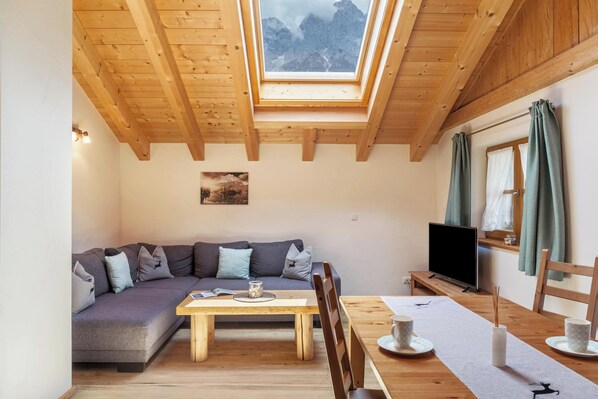 Ai piedi della Zugspitze, il nuovo e affascinante appartamento "Ferienhaus Huber" vi accoglie nel villaggio dell'Alta Baviera di Grainau. L'accogliente appartamento con vista sul Waxenstein e sulla montagna Zuspitze è composto da un soggiorno, una cucina ben attrezzata (con forno, piano cottura in vetroceramica, lavastoviglie, microonde, bollitore, frigorifero-congelatore, macchina per il caffè), 2 camere da letto e un bagno e può quindi ospitare 4 persone. Tra i servizi aggiuntivi figurano la connessione Wi-Fi (adatta alle videochiamate), una TV e il riscaldamento a pavimento in tutte le stanze. Su richiesta sono disponibili una culla e un seggiolone.