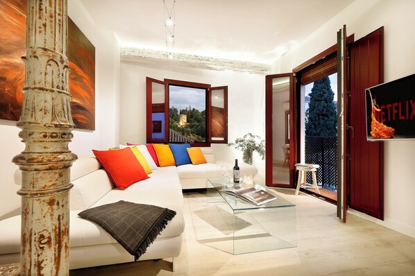 Il soggiorno, esposto a sud, ha due finestre e un balcone sulla strada principale con vista panoramica sull'Alhambra e sul Generalife. Un divano letto ad angolo doppio, TV a schermo piatto, tavolo da pranzo allungabile per ospitare fino a 6 persone e le rispettive sedie dal design moderno.