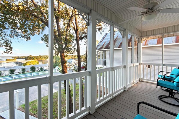 Enjoy the screened in front porch off the master bedroom with seating for four and awesome views of the harbor and lake.