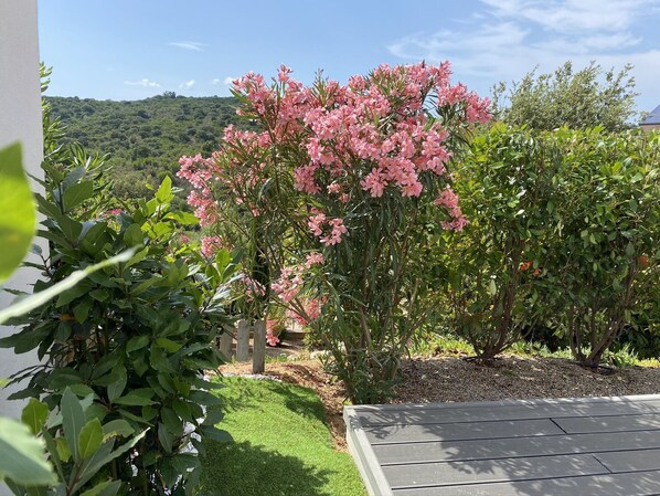 Per quanto riguarda la marca di fuori barbecue sedie 'Weber', un ampio tavolo da pranzo con ombrellone, un angolo 'spiaggia posteriore' con doccia e grata. prodotti essenziali (cucina e bagno) più capsule di caffè, un pacchetto canistrelli nella regione come un dono "